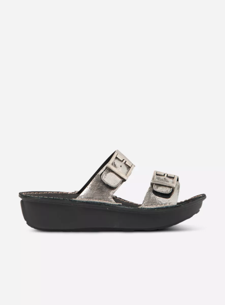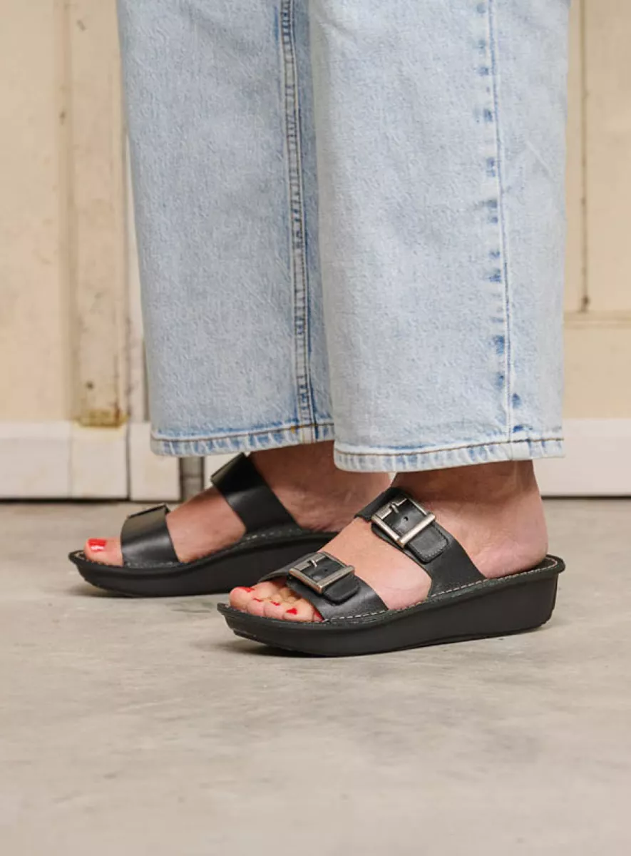 Experience effortless comfort every step of the way. This slip-on sandal features a fixed footbed for reliable support and a gently upturned toe for a smooth walking motion. The buckles are purely decorative—there’s Velcro underneath for a perfect fit every time. A great choice for those who want comfort without compromising style.